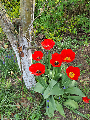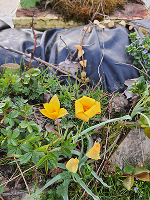Bild 1: Bergflockenblume, Bild 2: roter Ginster, Bild 3: Tulpen